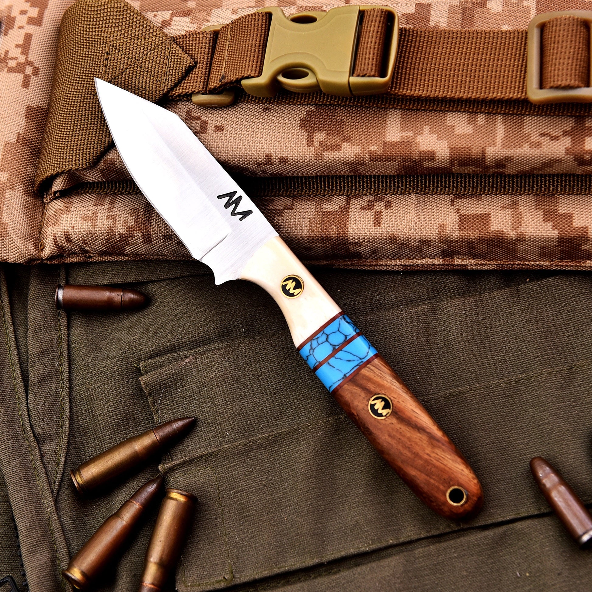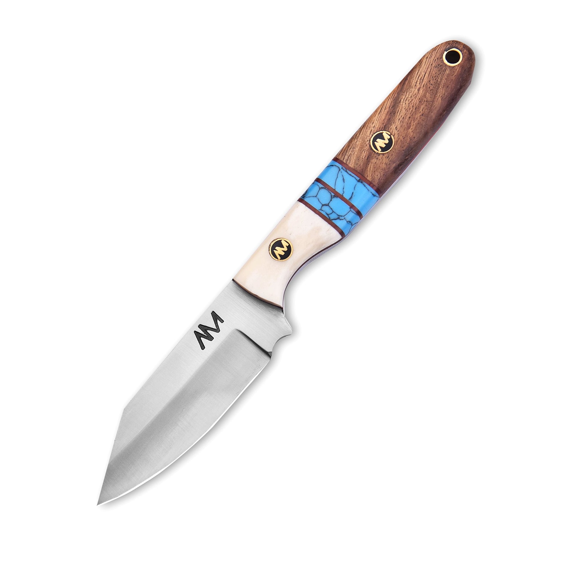 Bone, Turquoise & Rosewood Handle – A striking combination of natural materials for a unique, secure grip that blends traditional craftsmanship with outdoor functionality.
