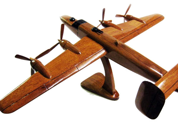 Handcrafted mahogany is the ideal material for this scale replica of the B-24 Liberator, one of America's most-loved bombers from WW II . Detailed with movable props and intricate carving, this aircraft is finished with three coats of polyurethane for high gloss and a deep wood grain. Stand included, Length: 18", Wing Span: 20".