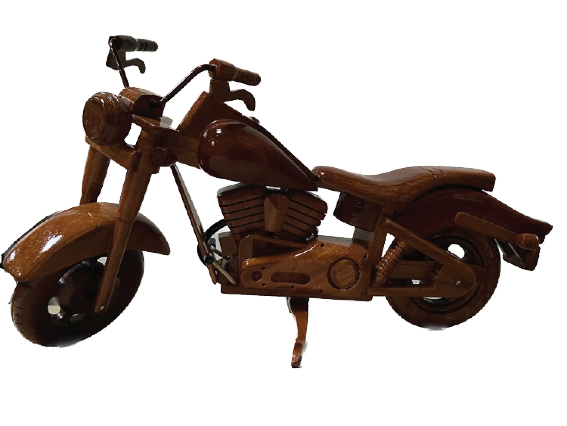 This is handcrafted from mahogany with a working kickstand and movable handlebars. This finely detailed replica is triple coated in high gloss polyurethane finish. 13” Long x 4” Wide x 7” High