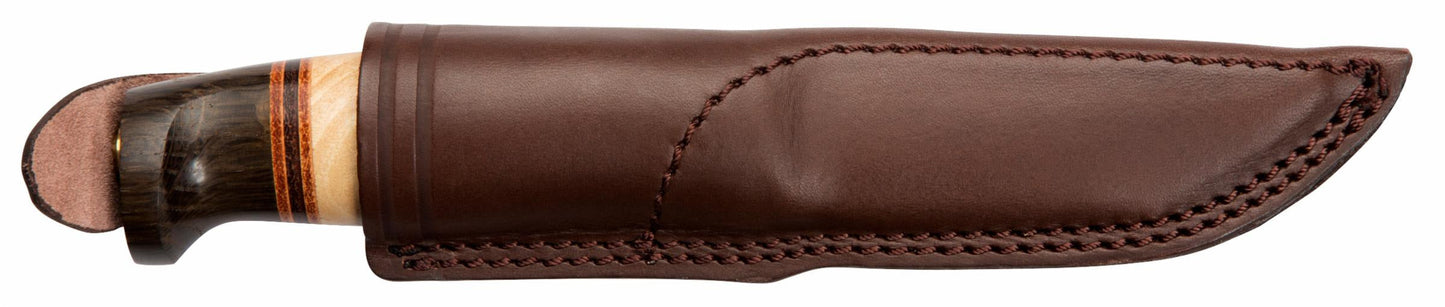 The beautiful, warm handle is made from curly birch and darkened oak. Blocks of wood that is separated by layers of colored leather. The handle has then been hand sanded to its barrel shape and polished by hand to a masterpiece.