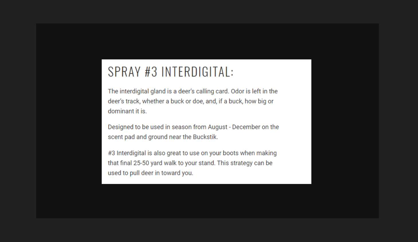 Deer use their sense of smell as their primary communication method with other deer. These scents come from 3 primary glands: Preorbital, forehead, and interdigital. Buckstik has developed a line of all three glands that are 100% pure and 100% natural. Processed in a laboratory setting to ensure purity and consistency these highly coveted glands have an unlimited shelf life, low evaporation rate, and unlike urines have no usage restrictions. A VERY powerful attractant, just one or two sprays are all that are needed to bring in dominant bucks.