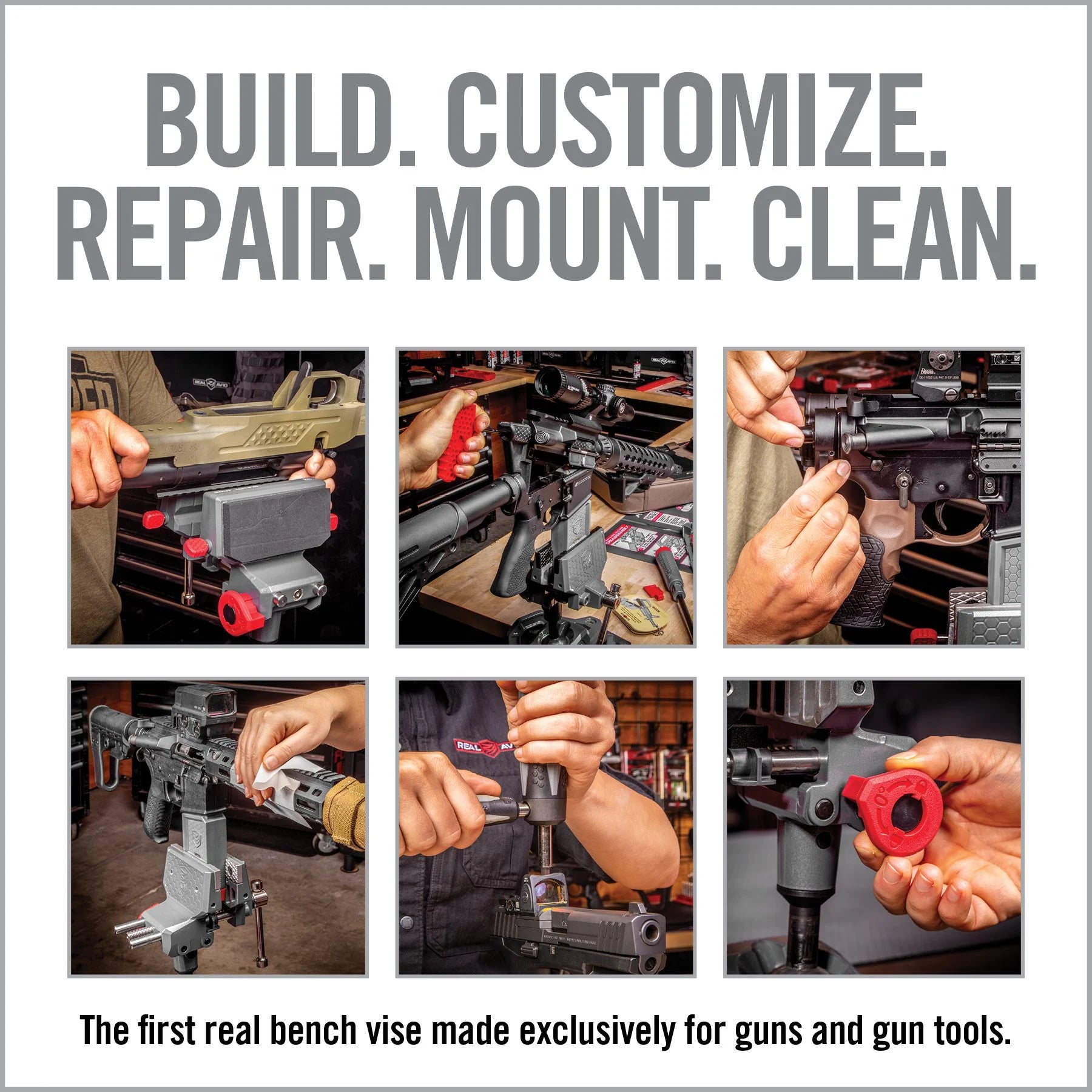 One vise to rule them all. The first real bench vise made exclusively for guns and gun tools. Whether you’re building and customizing, repairing and cleaning or mounting scopes and accessories, this vise improves every part of the GUN DIY® experience. Quickly reposition your gun to any orientation without ever removing it from the vise. Insert the Torq-Lok pin for applying heavy force. Use the removable and reversible Gun-Fit jaw sleeves for a specific gun grip or turn the leveling knob for simple scope mounting and leveling. Build. Customize. Repair. Mount. Clean. All hail the King…
