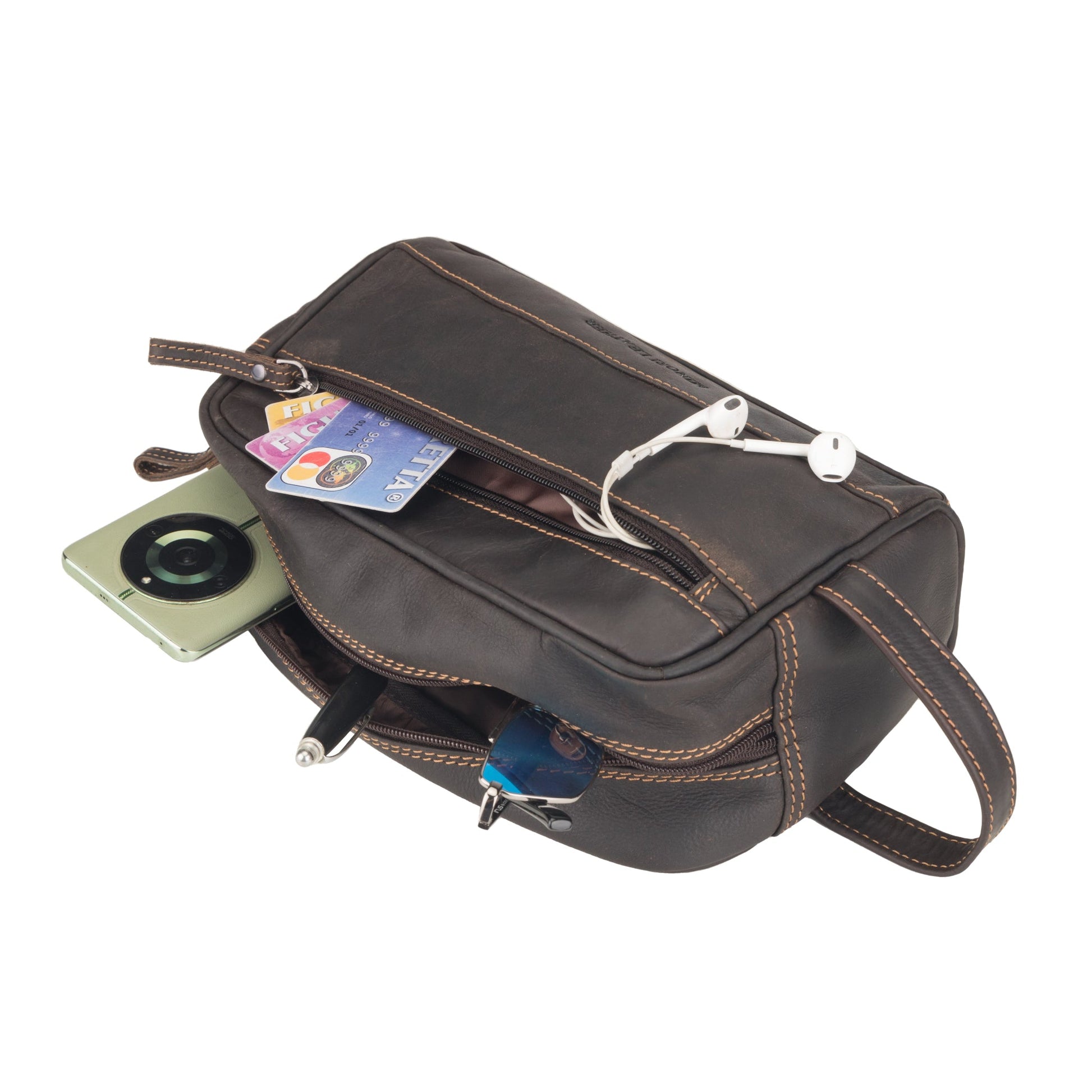 Handmade using rich brown full-grain wax oil pull-up leather, this dopp kit offers both utility and timeless appeal. Its spacious main compartment and smart zippered pockets are designed to keep your grooming gear, skincare, and everyday tools neatly organized whether you're heading out for a weekend or a cross-country adventure.