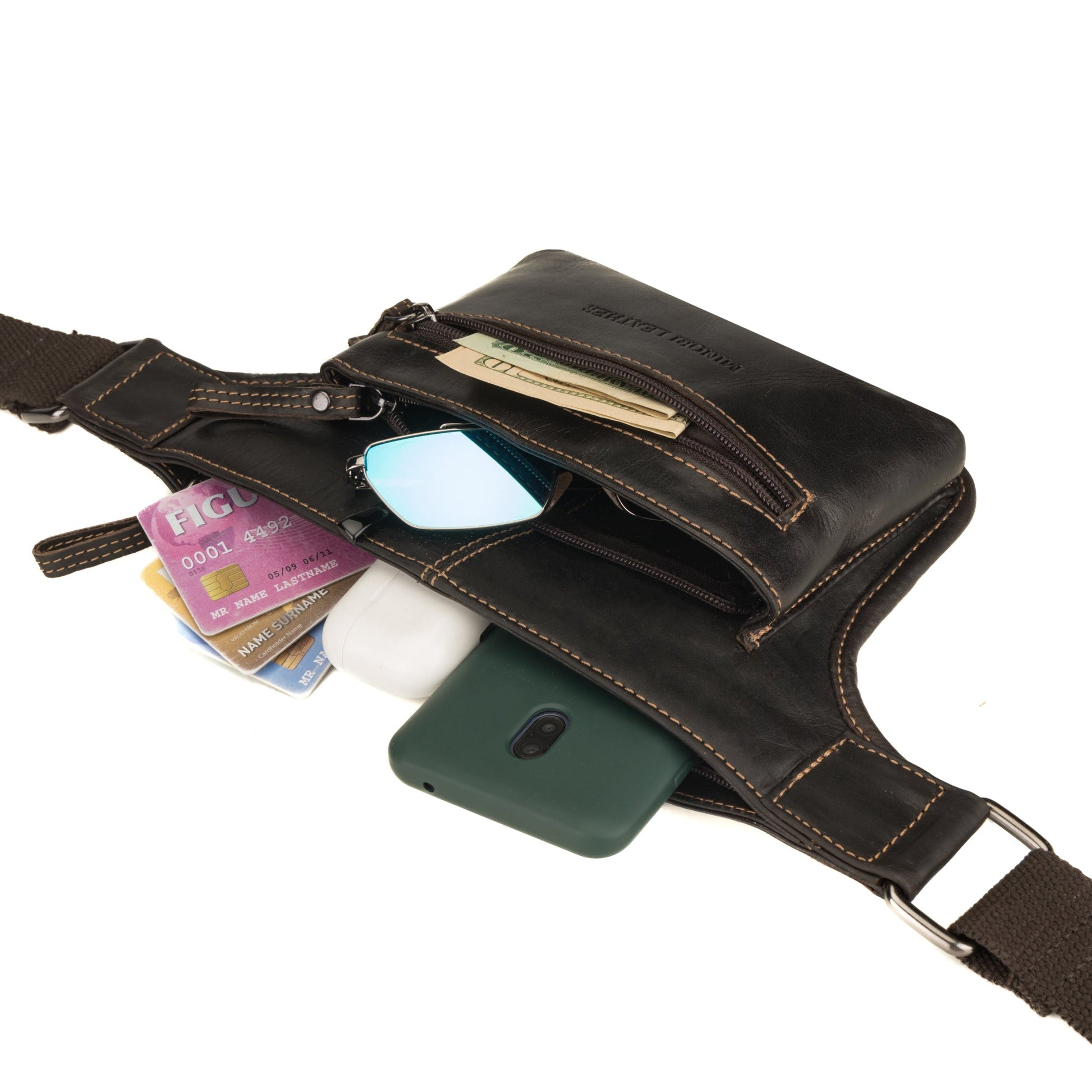 Main Compartment: 7" × 5" zippered section – roomy enough for phone, cash, cards, keys, earbuds, and sunglasses.