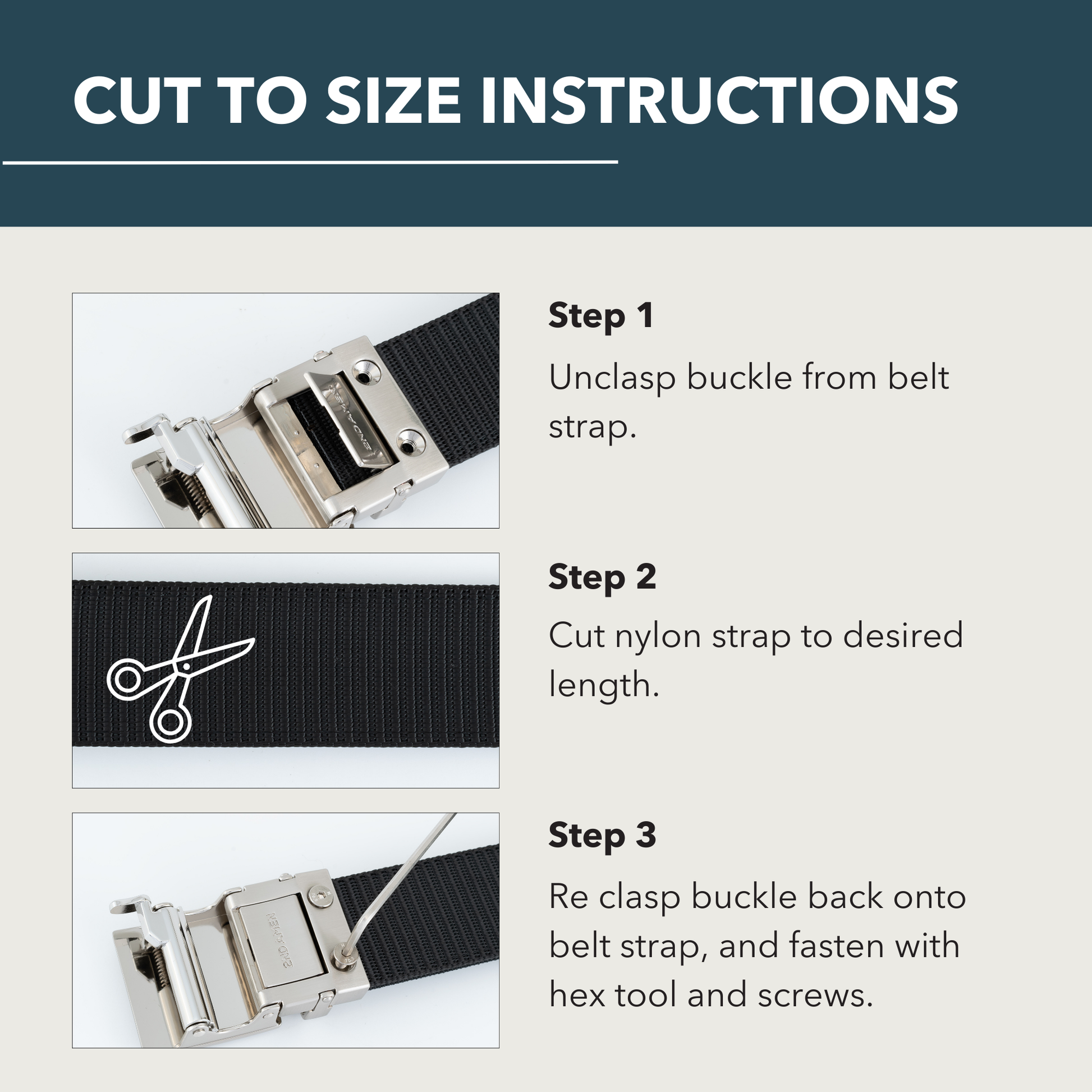 - Includes: Buckle, securing screws, hex tool, and setup instructions.