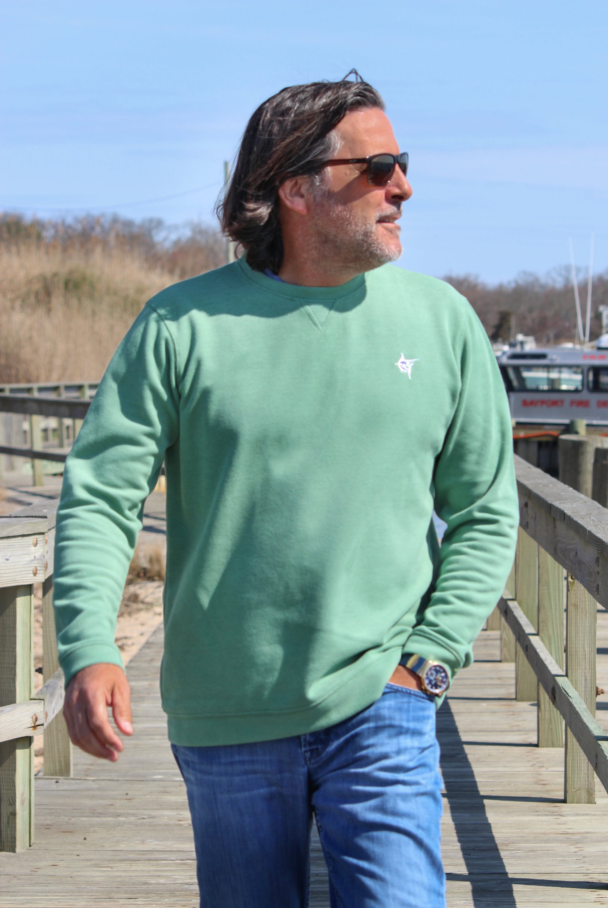 Using the same fabric as our popular South Shore ¼ zip. This Crew neck features soft ribbed cotton with fabric with added stretch for comfort. V-notch on the neck and icon logo embroidered on the left chest. Perfect weight for springtime and summer evenings. Great casual comfortable wear anywhere crew neck. The Sands Point is predominately made out of cotton so this piece will shrink if put in a dryer on high heat.