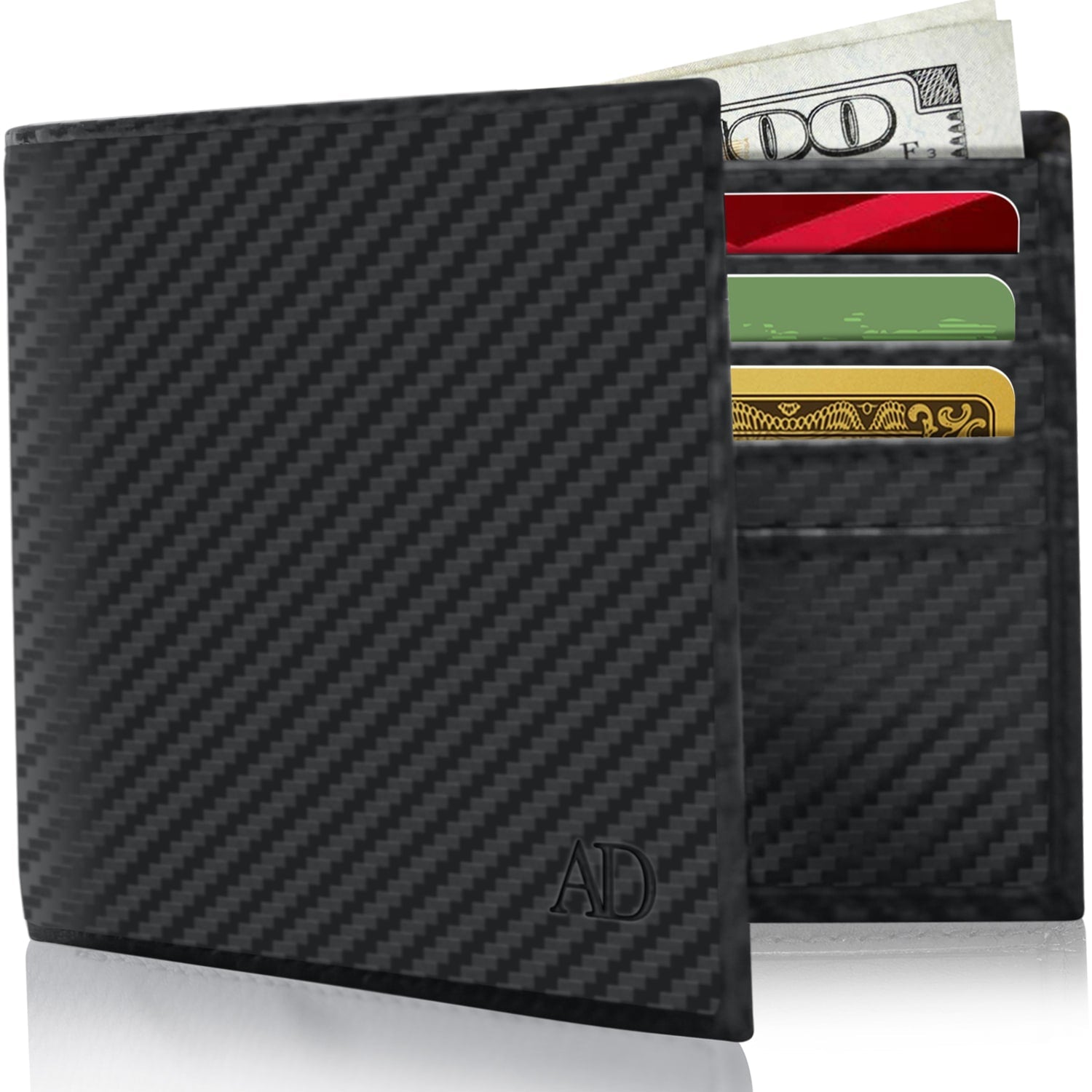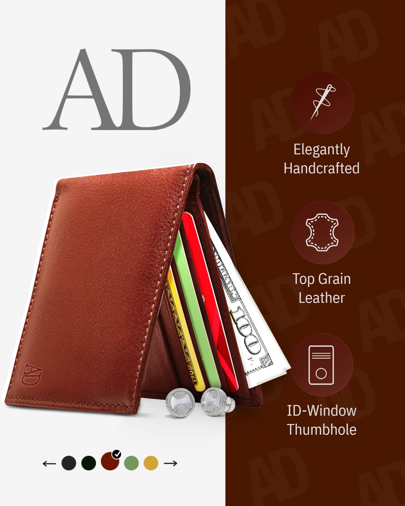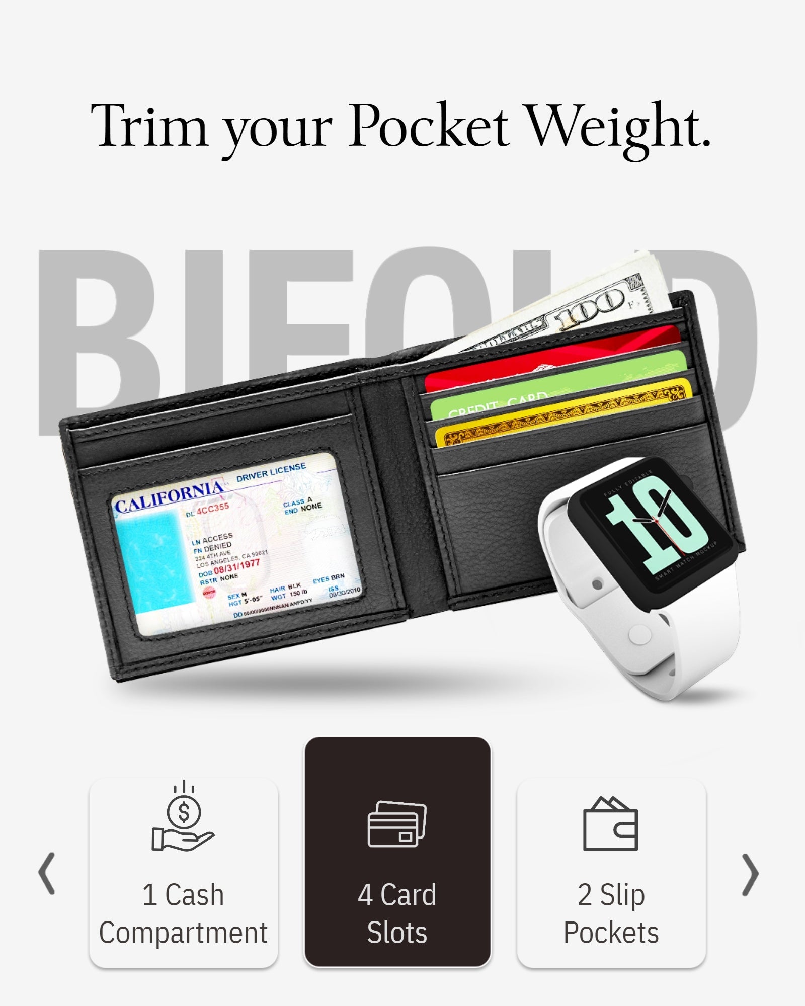 • This Wallet has 4 credit card slots, and ID Window, 2 slip pockets, and a cash compartment.