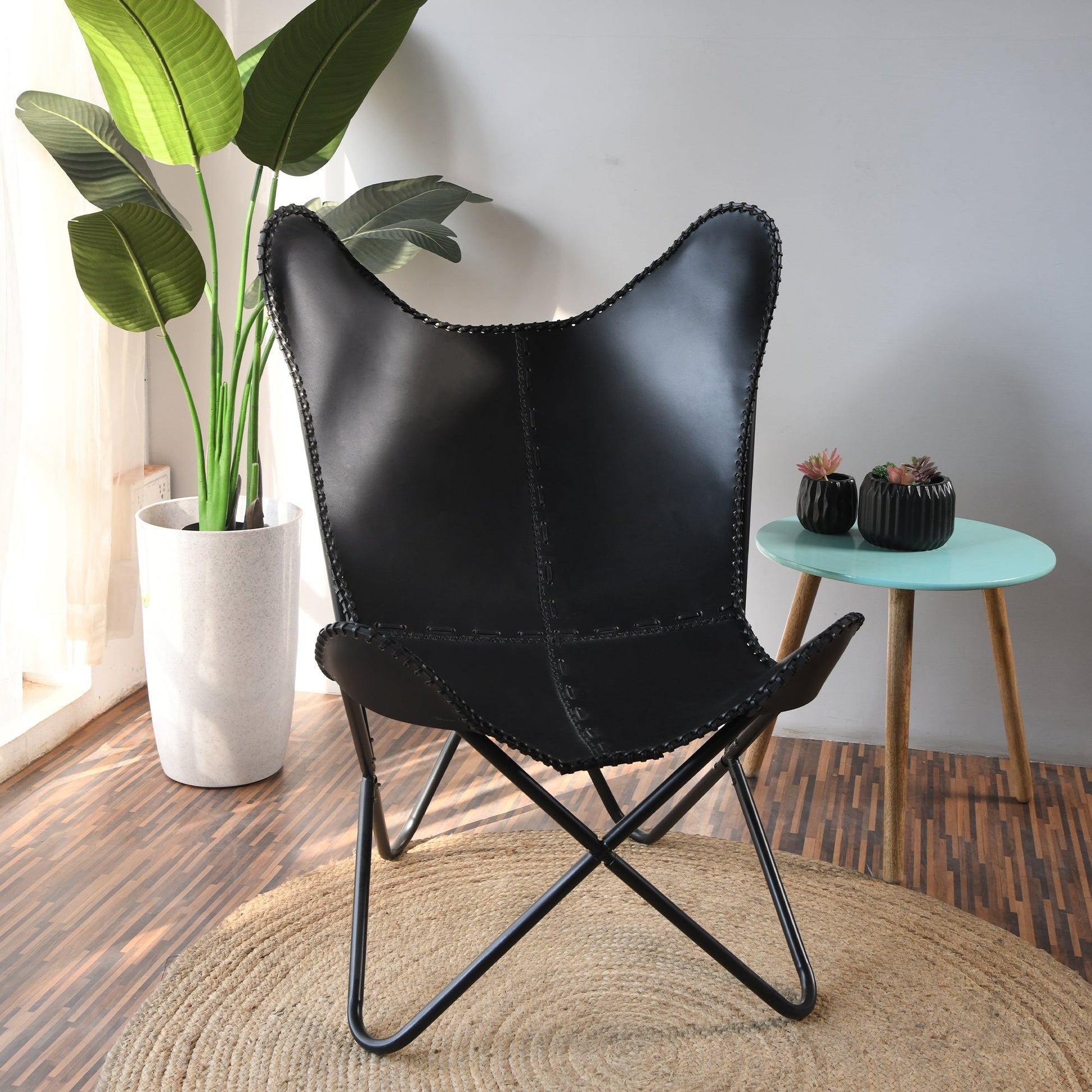 Experience living room comfort with our black leather, handcrafted butterfly chairs. Hand-made in the north-west of India by artisans whose craft has been handed down for generations.